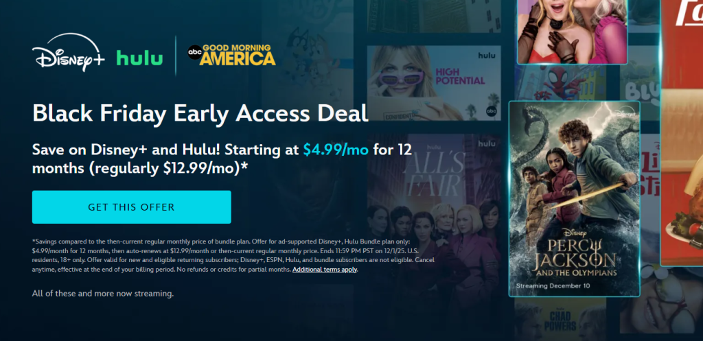 Disney+ and Hulu as a bundle are available for $4.99/month for 12 months through Disney’s Black Friday deal. Like the HBO deal, this is only for the ad-supported plan, and if you change plans at any point the discount goes away. Still, it’s a discount of over 60%.